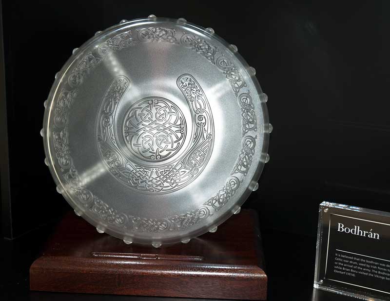 Tuesday the 22nd June 2010 was a momentous day for Waterford City with the opening of the new Waterford Crystal Centre and manufacturing facility on the Mall. A new beginning awaits the City with the resumption of crystal manufacture and sale right in the heart of the City. This impressive building is in an area which is currently being developed by Waterford City Council (who also facilitated and helped to finance the new Crystal centre) as a Viking Triangle, which will transform the City as a tourist destination. The new Waterford Crystal facility was officially opened by the Mayor Cllr John Halligan this morning who emphasised the importance of the new facility for the people of Waterford and the potential it has for promoting and enhancing the City and what it has to offer. There are some exceptional pieces on display in the new Centre. The Tall Ship may never sail but it would be a welcome addition to any shantymans baggage. Likewise the bodhran, a traditional Irish instrument which looks so well, even though it may never be played. Other pieces too are beautiful to look at and admire and will be cherished no doubt by those that purchase them. Today too a cruise ship, the Island Sky, anchored off Dunmore East and many of its guests undoubtedly travelled to the new Crystal Centre to see what was on offer. A fantastic place indeed and well worth a visit. It will also be a fine venue to sing in or even outside and will be a major attraction when the Tall Ships visit in 2011.