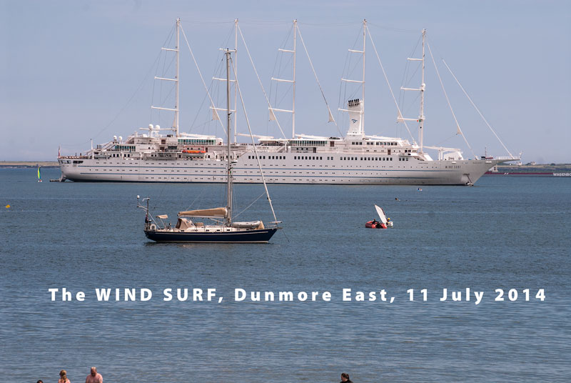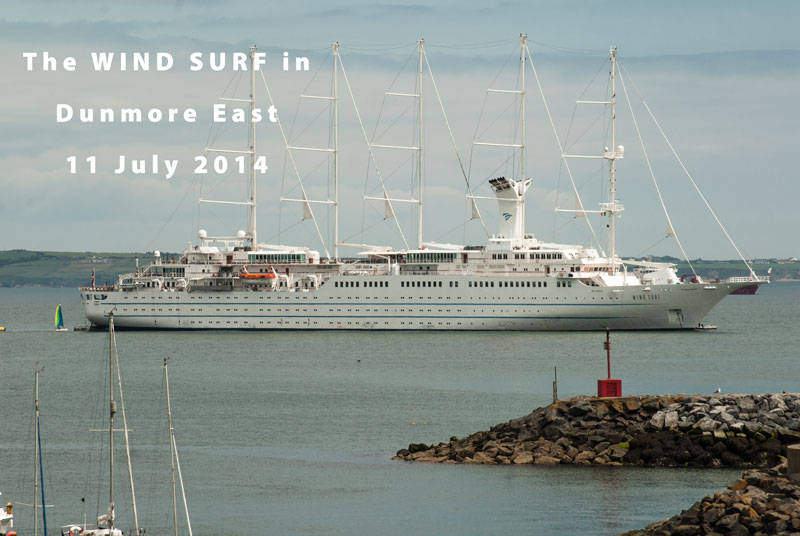 11 July 2014: It was great to see a cruise ship down in Dunmore East today and a good day it was too. There were a lot of people about doing all the various activities associated with Dunmore East on a summer's day (even an esteemed member of Hooks and Crookes was spotted with his grandson). The cruise liner outside added to the pleasant ambience of this beautiful coastal village. It is an unusual cruise boat too in that it has sails!.