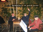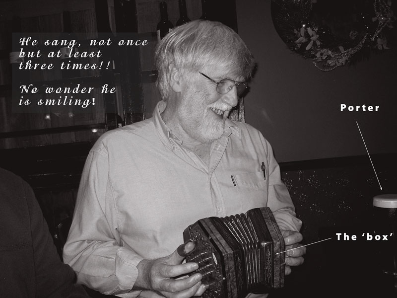 15th December: Well, we inflicted ourselves on the good people of south Kilkennyon Sunday night, all six of us (minust Tony and Eddie). We exercised our vocal chords as much as we could manage and we did what we do well for a few songs. And there we were thinking that it was the first blast of shanties ever to be sung there, only to hear South Australia and the Mermaid being sung in the back room, to where we adjourned for a lively session of music and song afterwards. Thanks are due to Frank and Ade Walsh for inviting us over. See Kilkieran Cottage for details of a a lovely restaurant in a lovely location high in the hills of south Kilkenny (Tullahaught means, apparently, Eight Hills).
