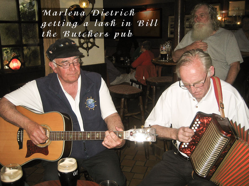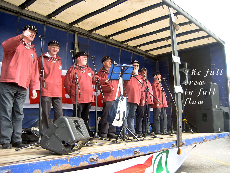 24 June: There were big crowds in Dunmore East for the annual Food festival and the quays were packed with people sampling all the delights on offer from the many stalls. The weather was reasonably good and was pleasant in the sunshine despite the strong breeze. We were onstage to round off the Festival but, unfortunately, the sun disappeared and the people with it as the strong wind meant it was just too cold. But we did what we had to do for those hardy souls that remained (and thank you for being so appreciative) and we did it well, as usual. Over then to the Yacht Club for some grub and only a little grog. We then adjourned to Bill the Butchers pub up in the village and after singing a few shanties, the ballads began. As the night matured a real lively session ensued with some superb contributions interspersed with the odd shanty. Ah there's nothing like an entire pub erupting in song. And what's more we didn't have to put our hands in our pockets all night (what hospitality). Another great day and a great night into the bargain. We are all definitely off the beer now (well 'till the next night anyway!).