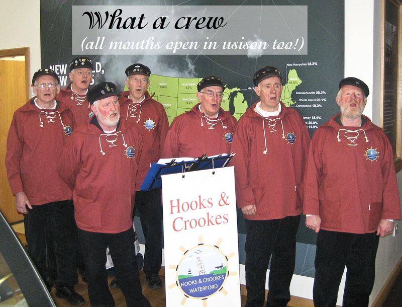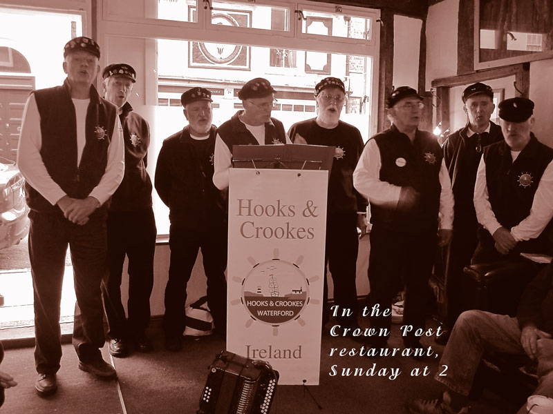 22 March: The Friends of Waterford Regional Hospital organised a charity concert to raise badly needed funds for WRH, and Hooks and Crookes were delighted to perform in this lovely Church for such a good cause. Several acts performed and it was a great night of songs and singing. We sang second after the interval and from our vast repertoire we entertained the audience with A Drop of Nelson's Blood, Lady of Autumn, Haul on the Bowline and Time Ashore. Fair play to the audience too for venturing out on what was a bad night; everyone agreed that it was worth it for the quality and variety of the singing.