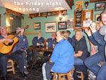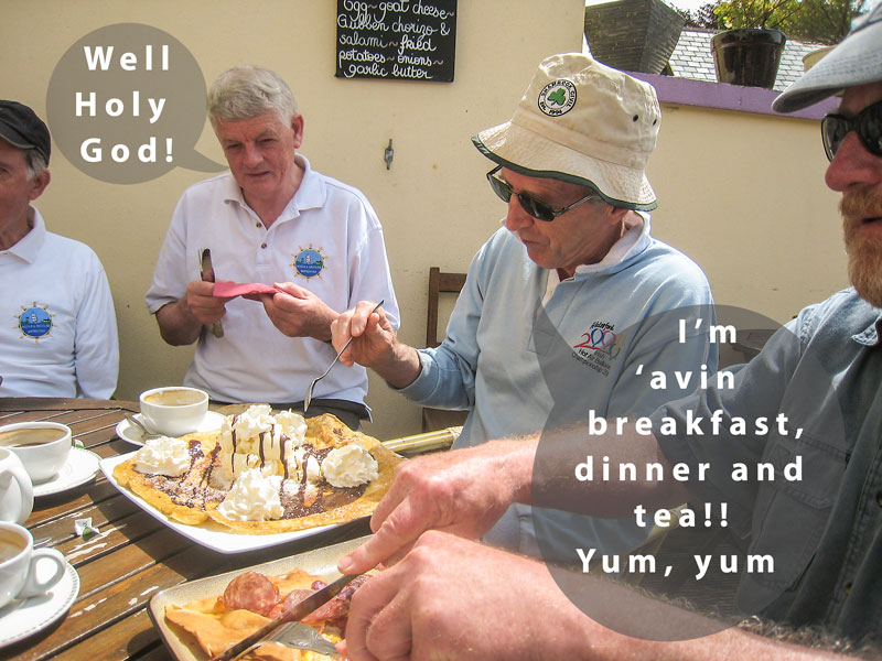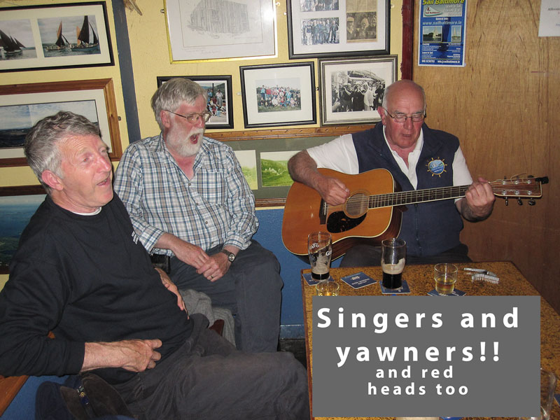 Two cars left Waterford at 3pm on the Friday afternoon and headed for west Cork (two of the crew had earlier gone on the bus with Riggerloftets). After safely arriving and settling in to Dan's place just outside Ballydehob, we headed into town for a pint and a chat and to watch a bit of the World cup game (Spain v Holland). Our only gig on Friday night in the Sandboat pub was late (after 12) and it was quiet enough there too but it gave us a chance to warm up. We sang a few ballads later on and then we watered our tonsils to keep them in good shape for the following day. We were up early enough on Saturday morning and we headed for Schull where we had a stroll around and we enjoyed some fantastic crepes before heading back to Ballydehob where the two lads, Joe and Olly, performed well with their respective songs in the song-writing competition. Alas, the expected bonanza (drink for the crew) didn't materialise so we had to buy our own for the rest of the weekend. We had four performances thereafter in Vincent Coughlans bar and in the Sandboat and it was great fun, especially in that we were either performing before or after Riggerloftets, so we could enjoy each others songs and company. We also had a chance too to hear some of the other performers at the various venues. We sat down with Riggerloftets for dinner on Saturday evening and that was memorable, with plenty of wine flowing, the odd toast and song and plenty of chat. It was a great day really, the weather was good, so was the company and the dwink flowed freely. We were joined in the afternoon by our great friend Franke Bowe and he added another element to the craic with his constants anecdotes about various characters he has met and places he has been. We also met Jack bergin, a former work colleague of some of the crew, now permanently domiciled in west Cork.