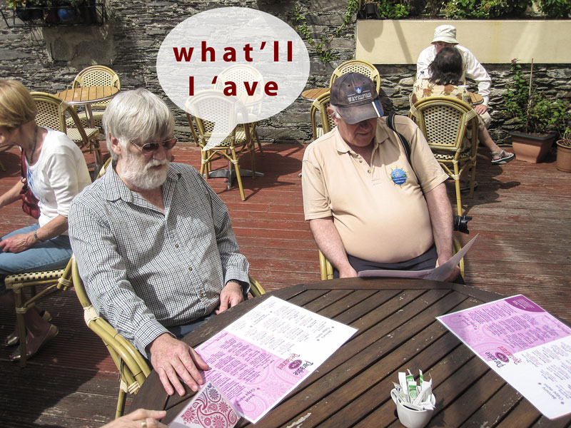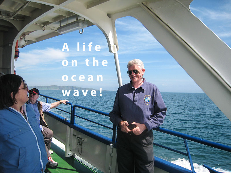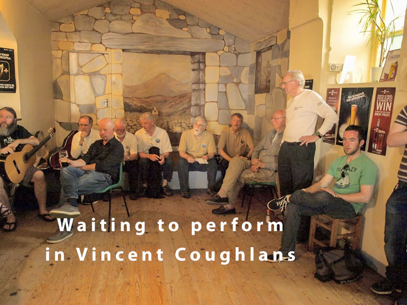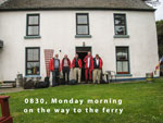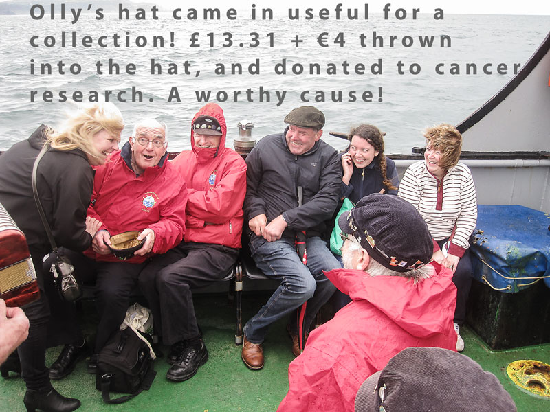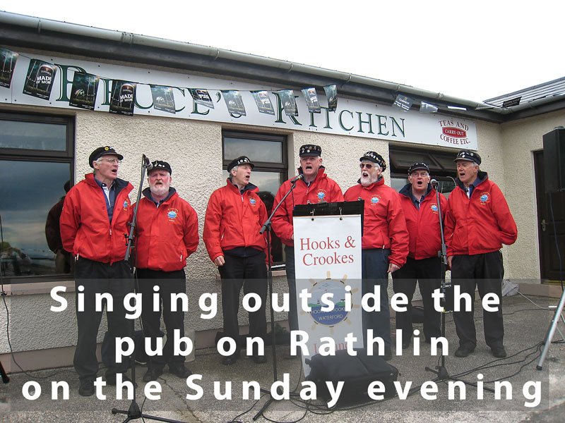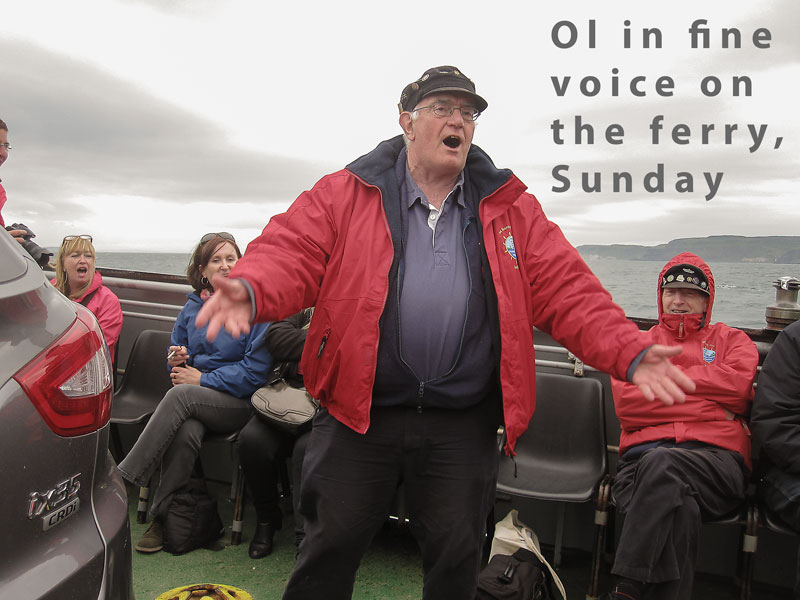 We had a fantastic weekend in Antrim. It might have been a long journey from Waterford to Ballycastle but it was worth it. Great people, great weather, lovely landscapes and great craic too. We sang in restaurants, pubs, at the ferry terminal, on stages, in bars and outside bars and we even had an impromptu sing-song on the ferry back from Rathlin in roughish weather: 'ah go on, gives us one song', which we did but we ended up singing seven songs, in the fresh air, and was it fresh!–one wave broke over the deck and saturated some of the crew who, unmoved, sang on!. Our audience grabbed Olly's hat and made a collection for us (has that ever happened us before?) and the proceeds of that collection we decided to donate to cancer research. Yes, definitely a memorable weekend and one that will live long in the memory. Many thanks to all the lovely people of Antrim who made our stay such an enjoyable one.