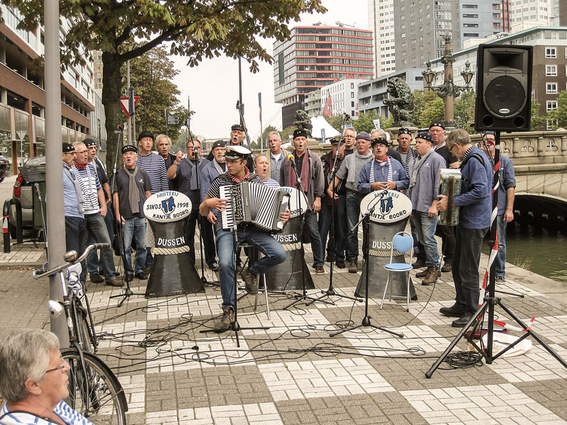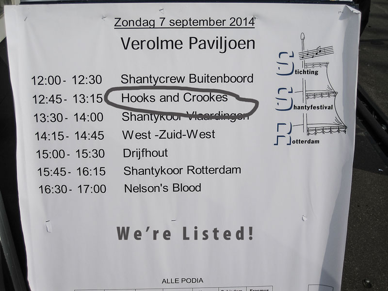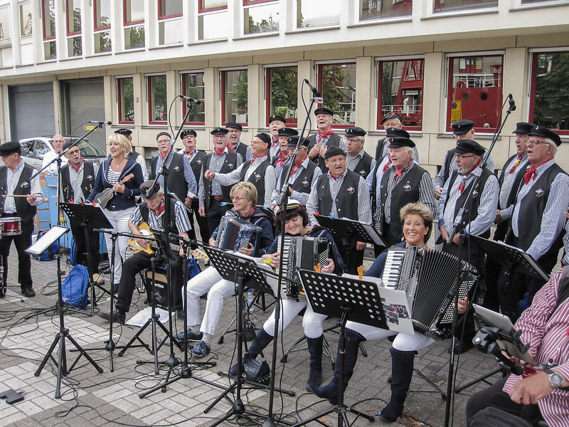 We had only finished our last song on the Sunday afternoon and we had to rush for the train and plane back to Dublin. That song was a rousing version of the Wild Rover, and it echoed all over the centre of Rotterdam as we were joined in song by our audience, who knew every word, as indeed they knew the words of the Fields of Athenry and Molly Malone, which we included in some of our sessions for a bit of variety. In fact the Fields of Athenry was a particular favourite and some of the groups included this song in their repertoire. Shantykoor Barend Fox even invited us up onstage to sing with them when they were singing it. Wonderful.
